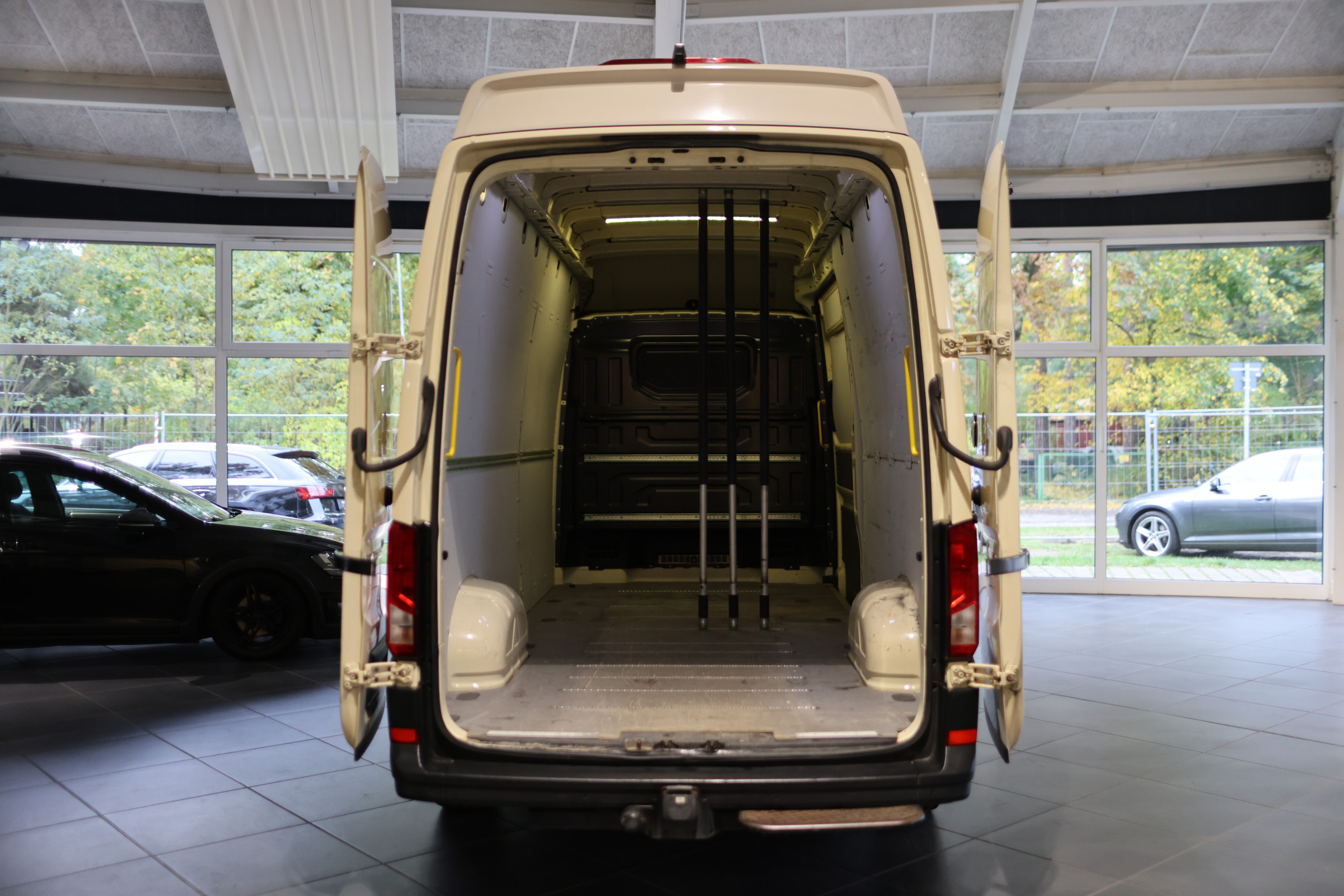 Serien-Ausstattung: Ablage-Paket 2, Anti-Blockier-System (ABS), Außenspiegel konvex, links, Außenspiegel konvex, rechts, Blinkleuchten LED in Außenspiegel integriert, Bodenbelag im Fahrerhaus: Gummi, CW-Wert-Unterbodenverkleidung, Einstiegsgriff an Hecksäule hinten links, Einstiegsgriff an Hecksäule hinten rechts, Elektron. Stabilitäts-Programm (ESP), Fahrassistenz-System: Berganfahr-Assistent, Fahrassistenz-System: Bremsassistent (HBA), Fahrassistenz-System: Seitenwind-Assistent, Fensterheber elektrisch vorn, Frontscheibe Verbundglas, Getriebe Automatik - (8-Stufen), Haltegriffe A-Säulen, Heckflügeltüren ohne Verglasung, Innenleuchten im Fahrerhaus: LED, Innenleuchten im Lade-/FG-Raum: LED, Karosserie/Aufbau: Kasten Grossraum Standard, Karosserievariante: Super Hochdach (GFK Ausführung), Kraftstofftank: 75 Ltr., Kühlergrill mit Chromleiste oben, Lenksäule (Lenkrad) verstellbar, Leuchtweitenregelung, LKW-Zulassung, Markierungsleuchten seitlich, Radstand 4490 mm, Reifen-Reparaturkit, Rußpartikelfilter, Schadstoffarm nach Abgasnorm Euro 6, Schiebetür Lade-/Fahrgastraum rechts, SCR-System (AdBlue-Technologie), Servolenkung elektro-mechanisch, Sitzbezug / Polsterung: Stoff, Start/Stop-Anlage Motor, Staufach über Fahrerhaus (vom Laderaum zugänglich), Steckdosen (12V-Anschluß) im Fahrerhaus (2 Stück), Verzurrösen Laderaum, Warnanlage für Sicherheitsgurt (Fahrerseite), Wegfahrsperre (elektronisch), Wärmeschutzverglasung, Zentralverriegelung mit Fernbedienung und Innenbetätigung, Zul. Gesamtgewicht 3,50 t