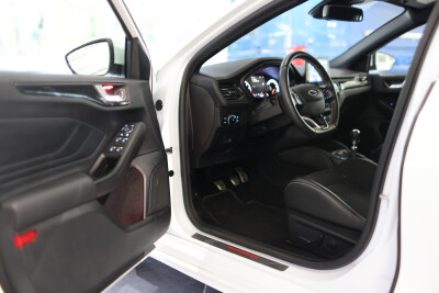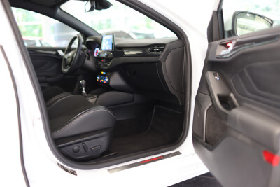 Serien-Ausstattung: Airbag Beifahrerseite abschaltbar, Anti-Blockier-System (ABS), Antischlupfregelung (ASR), Audio-Navigationssystem Ford mit AppLink, Außenspiegel elektr. anklappbar, Außenspiegel elektr. verstell- und heizbar, Blinkleuchte in Außenspiegel integriert, Body-Styling-Paket, Bord-/Verbrauchscomputer, Dachhimmel Stoff, dunkel, Dachreling schwarz, Dachspoiler (große Ausführung) Wagenfarbe, Diebstahl-Warnanlage, Dimmer Instrumentenbeleuchtung, Doppelendrohr Auspuffanlage, Elektr. Bremskraftverteilung (EBD), Elektron. Differentialsperre (EDS), Elektron. Stabilitäts-Programm (ESP), Fahrassistenz-System: Berganfahr-Assistent (Hill-Holder), Fahrassistenz-System: Notbrems-Assistent, Fahrassistenz-System: Post-Collision-System, Fahrassistenz-System: Pre-Collision-System, Fahrassistenz-System: Spurhalteassistent, Farbdisplay für Bordcomputer, Fensterheber elektrisch vorn + hinten mit Komfortschließung, FordPass Connect inkl. eCall, Gepäckraumabdeckung / Rollo, Geschwindigkeits-Regelanlage (Tempomat), Innenraumfilter: Staub- und Pollenfilter, Innenspiegel mit Abblendautomatik, Intelligent Protection System (IPS), Intelligenter Geschwindigkeits-Begrenzer, Isofix-Aufnahmen für Kindersitz, Klimaautomatik 2-Zonen, Kopfstützen hinten mechan. verstellbar (3 Stück), Kopfstützen vorn 4-fach verstellbar, Laderaumboden verstellbar, Lenkrad (Sport/Leder, ST), Lenksäule (Lenkrad) höhen-/längsverstellbar, Mittelkonsole Premium, Otto-Partikelfilter (OPF), Parkbremse elektrisch mit Auto-Hold-Funktion, Parkpilotsystem vorn und hinten, Pedale Aluminium, Power KeyFree-Startfunktion, Reifen-Reparaturkit, Reifendruck-Kontrollsystem, Rücksitzlehne geteilt/klappbar (60:40), Schadstoffarm nach Abgasnorm Euro 6d-TEMP, Schalt-/Wählhebelgriff Aluminium, Schaltpunktanzeige, Scheibenwischer mit Regensensor, Scheinwerfer mit abgedunkelten Hintergrund, Scheinwerfer mit Ausschaltverzögerung, Scheinwerfer-Assistent mit Tag-/Nachtsensor, Servolenkung elektrisch, Sitz vorn links höhenverstellbar, Sonnenblende links mit Spiegel, Sonnenblende rechts mit Spiegel, Sportsitze vorn (Recaro) Teilleder, Start/Stop-Anlage, Steckdose (12V-Anschluß) im Koffer-/Laderaum, Tagfahrlicht LED, Verglasung getönt, Warnanlage für Sicherheitsgurte hinten, Warnanlage für Sicherheitsgurte vorn