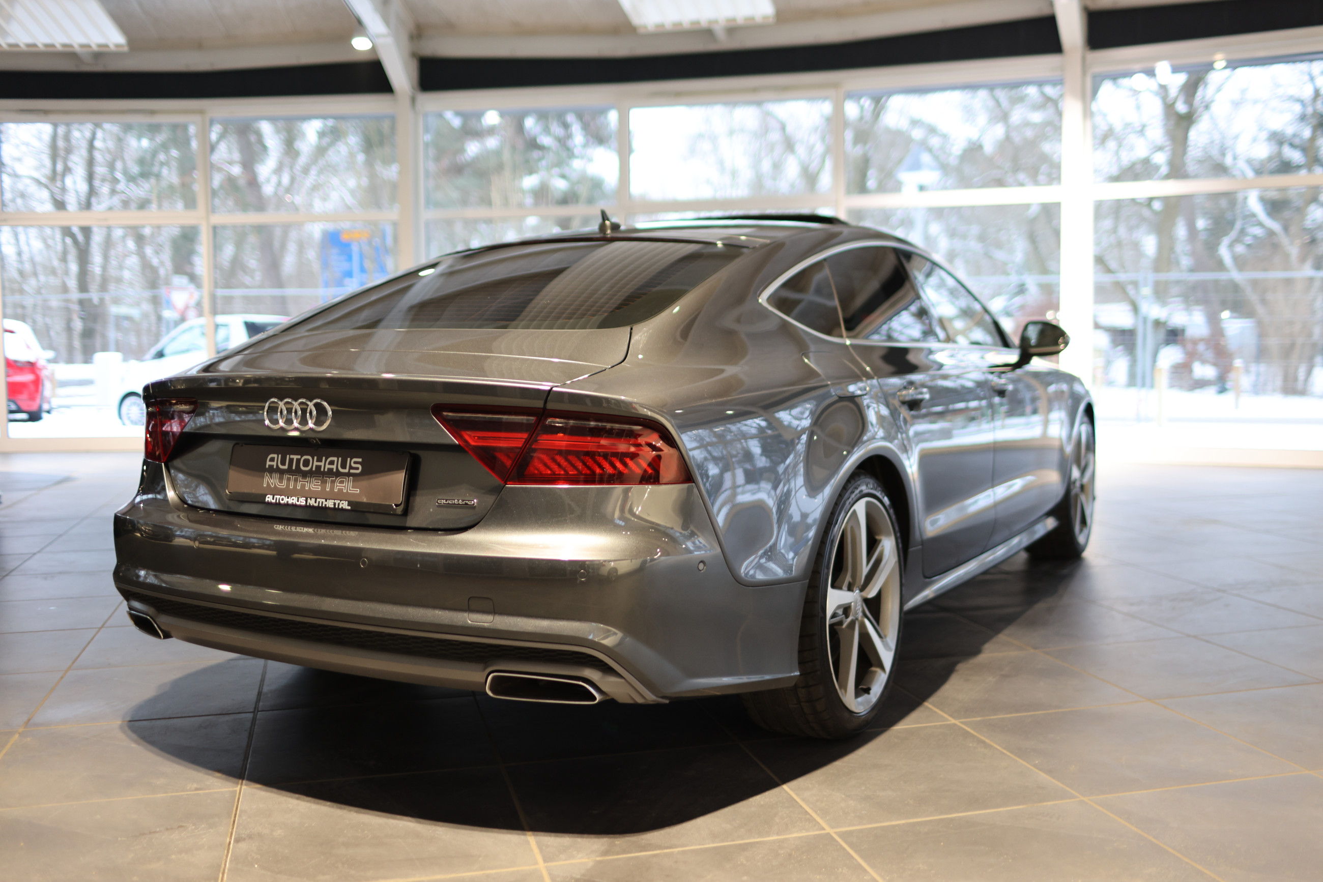 Serien-Ausstattung: Airbag Fahrer-/Beifahrerseite, Anti-Blockier-System (ABS), Antriebs-Schlupfregelung (ASR) mit EDS, Antriebsart: Allradantrieb, Audi Drive Select, Außenspiegel asphärisch, links, Außenspiegel asphärisch, rechts, Außenspiegel Wagenfarbe, Einstiegsleisten mit Aluminiumeinlage, Elektron. Stabilitäts-Programm (ESP), Elektron. Stabilitätskontrolle (ESC), Fahrassistenz-System: Anfahr-Assistent (hold assist), Fensterheber elektrisch vorn + hinten, Gepäckraumklappe elektr. betätigt (öffnen + schliessen), Geschwindigkeits-Regelanlage (Tempomat), Getriebe 7-Gang - Doppelkupplungsgetriebe S-tronic, Glanz-Paket, Heckklappe mit Spoiler integriert, Heckleuchten LED, Heckspoiler (elektrisch ausfahrbar), Isofix-Aufnahmen für Kindersitz, Kopf-Airbag-System (Sideguard), Kraftstofftank: 75 Ltr., Lenksäule (Lenkrad) mech. Höhen-/Längsverstellung, Licht- und Regensensor, Mittelarmlehne hinten mit Fach, Mittelarmlehne vorn, Multifunktionsanzeige / Bordcomputer, Parkbremse elektro-mechanisch, Raucher-Paket, Reifenkontroll-Anzeige, Rußpartikelfilter, Schadstoffarm nach Abgasnorm Euro 6, Schalt-/Wählhebelgriff Leder, Seitenairbag vorn, Start/Stop-Anlage, Wegfahrsperre (elektronisch), Zentralverriegelung mit Fernbedienung