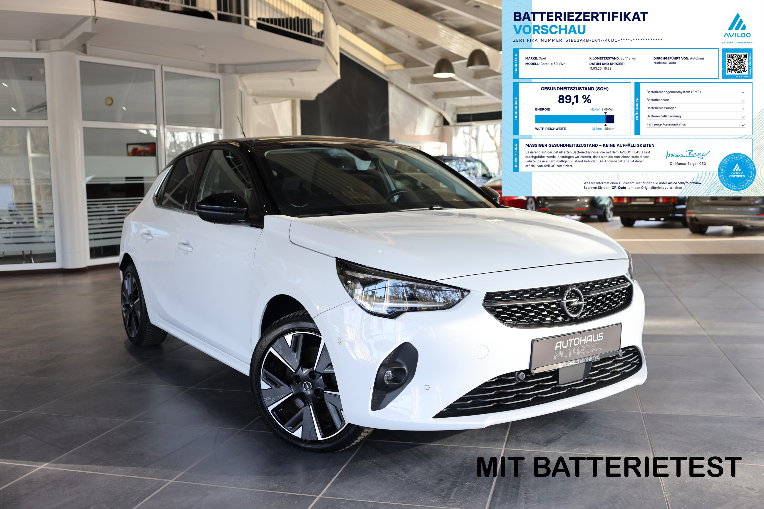 Serien-Ausstattung: 6 Lautsprecher, Airbag Fahrer-/Beifahrerseite, Akustischer Fußgängerschutz (Außensound), Anti-Blockier-System (ABS), Audiosystem Multimedia, B-Säulen schwarz Hochglanz (außen), Bordcomputer, Bremsassistent, Dach Kontrast-Lackierung, Elektrische Schnellheizung (Quickheat), Elektrofahrzeug, Elektromotor 100 kW (cont. 57 kW), Elektron. Stabilitäts-Programm Plus (ESP), Fahrassistenz-System: Berganfahr-Assistent (HSA, Hill Start Assist), Fahrassistenz-System: Müdigkeitserkennungs-Sensor, Fahrassistenz-System: Spurhalteassistent, Fahrassistenz-System: Verkehrszeichenerkennung, Farbdisplay (7 Zoll), Fensterheber elektrisch vorn + hinten, Fensterheber vorn elektr. mit Einklemmschutz, Fernbedienung zur Aktivierung der Heizung/Klimaanlage, Feststellbremse elektrisch, Gepäckraumbeleuchtung (LED), Getriebe für Elektrofahrzeug, Heckscheibenwischer, Isofix-Aufnahmen für Kindersitz an Beifahrersitz, Isofix-Aufnahmen für Kindersitz an Rücksitz, Karosserie: 5-türig, Klimaautomatik, Kopf-Airbag-System, Ladekabel mit Schukostecker (Mode 2), Ladevorrichtung On-Board-Lader (11 kW), Lenkrad (Sport/Leder - 3-Speichen, unten abgeflacht) mit Multifunktion, Lenksäule (Lenkrad) verstellbar, Leseleuchten vorn (2), LM-Felgen, Mittelarmlehne vorn mit Ablagefach, Motor Starterknopf, Nebelscheinwerfer LED, Nebelschlussleuchte, Opel Connect, Reifen-Reparaturkit, Rücksitzbank geteilt/klappbar (60:40), Scheinwerfer LED, Seitenairbag vorn, Sicht-Paket, Sitzbezug / Polsterung: Stoff / Ledernachbildung, Stoßfänger Wagenfarbe, Türgriffe außen Wagenfarbe, Türgriffe innen verchromt, Warnanlage für Sicherheitsgurt, Beifahrerseite, Warnanlage für Sicherheitsgurt, Fahrerseite, Warnanlage für Sicherheitsgurte hinten, Wärmepumpe zur Reichweitenoptimierung